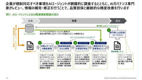 同サービスでは、AIエージェントがWeb上のAI規制の最新情報を自律的に収集・分析し、結果を同社のAIガバナンス専門家がレビューすることで、規制情報の網羅的な整理や、高精度なリスク評価、対応策の提案を行なう。各国・地域の情報を網羅的に扱うため、提供地域ごとのリスク評価にも対応する。
