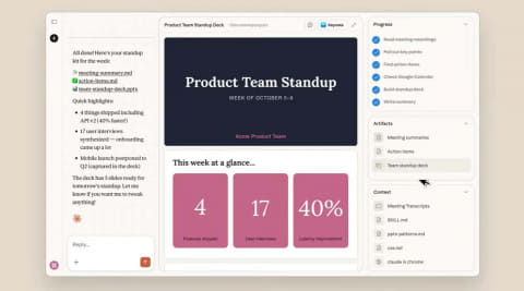 Coworkでは、通常のチャットの会話よりも主体的にこうした作業を遂行。タスクを設定すると、Claudeが計画を立てて実行し、進捗を随時共有する。Claude Codeにおける自律的なコーディングと同様だが、Coworkは、コーディング不要のタスク向けに改良されている。