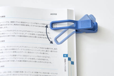 横からはさむ構造で、クリップを上げるだけでページめくりが可能。めくるたびにクリップを取り外す手間を解消した。また、クリップをカチッと音が鳴るまで押し込むと開いた状態を保持できるロック機構を備えている。