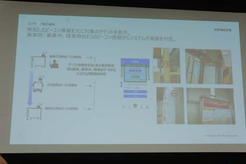 つくチケは、日立製作所らが提供する複数の交通機関や観光・小売サービスを1つのアプリでシームレスに利用できるというサービス。今回はバス停や駅、小売店などにビーコンを設置することで、そのエリアに近づくと自動でアプリが起動してチケットが表示され、そのまま乗車して、降りたらそのバス停のビーコンで検出して運賃を確定する、という後払いの仕組みを構築した。