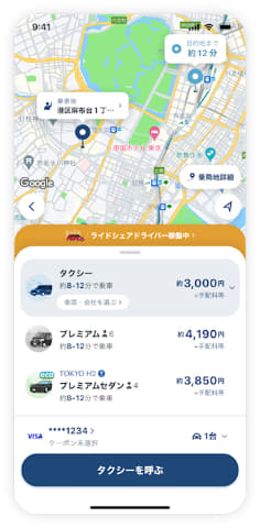 料金は、迎車料金・手配料に加え、運賃と迎車料金の0〜50%分をプレミアムチャージとして徴収。プレミアムチャージは下限料金500円からで、料率は需給バランスに応じて変動する。