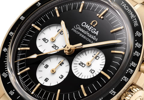 ブラックのダイヤルに対し、サブダイヤルをホワイトで仕上げた“リバースダイヤル”が特徴のスピードマスター。ダイヤルは2枚のプレートを重ねた構造で、上層はニス塗装とラッカー仕上げによる光沢感のあるブラック。下層のサブダイヤルはホワイトのニス塗装とラッカー仕上げで、サブダイヤル外周のフレームはロジウム仕上げになっている。ベゼルリングはブラックセラミック製で、タキメータースケールはホワイトエナメルで刻まれる。