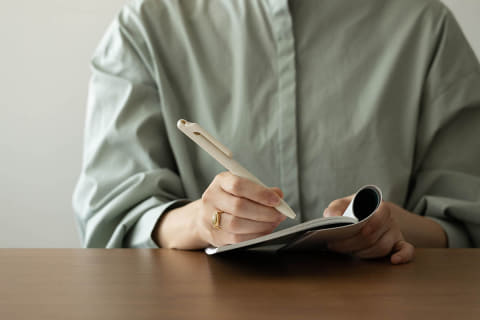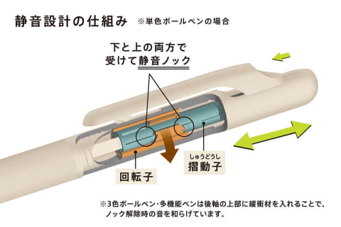 カルムでは単色ボールペンと多色・多機能ボールペンそれぞれに最適な異なる機構を開発、採用し、ボールペンのノック時の操作音を低減。会議室や自習室、図書館などの静かな場所でも、周りを気にせず使用できる仕様とした。また、ノック作動時に手に感じる衝撃も和らげている。