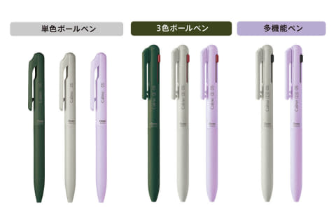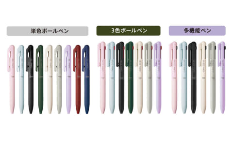インキ色は、単色ボールペンが黒、3色ボールペンが黒・赤・青、多機能ペンが黒・赤・シャープペン。ボール径はいずれも0.35mm、0.5mm、0.7mmをラインアップする。