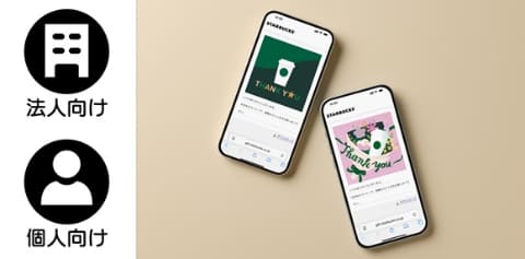 法人名入れスターバックス カードは、ロゴや社名・メッセージを指定部分に印刷できる。従業員向けの記念品、学校行事や自治体のお祝い品などでの利用を想定しており、専用のデザイン封筒に封入して届けられる。デザインは、カード、封筒ともに複数デザインから選択できる。送料は無料(日本国内、1カ所のみ)。