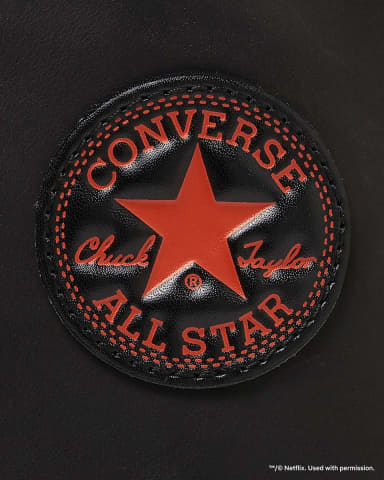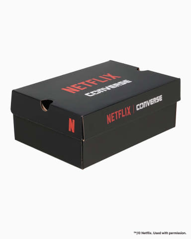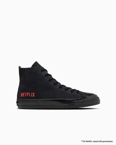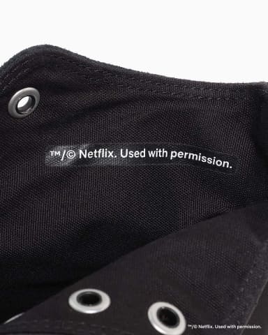 コンバースの定番シリーズ「オールスター エイジド」をベースにブラックを基調として、Netflixの象徴的なレッドをアクセントにした。外腰にはNetflixロゴを刺繍し、タン裏にはプロフィールアイコンのスマイルマークラベルを配している。アッパーにはレッドステッチを効かせ、さりげないアクセントもプラス。