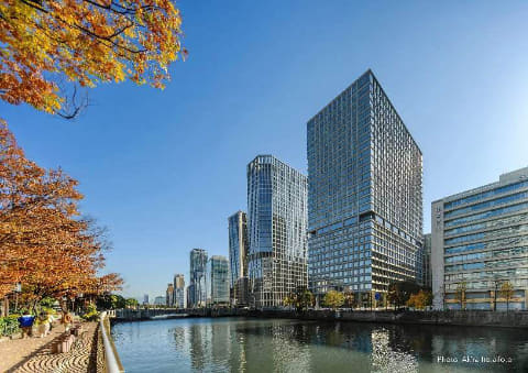 建物外観は、基壇部を強調することで御堂筋景観との調和を図るとともに、交差点に対しても印象的な顔を持つ重厚感のあるデザインとした。また、土佐堀川の水辺景観や緑とのつながりを意識し、遠景からの存在感やシルエットの美しさにもこだわったという。