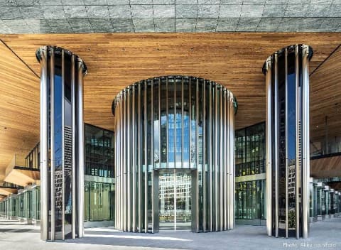 メインエントランスの特徴は、鏡面仕上のマリオンとガラスで構成されたシリンダー。土佐堀川の水面のように煌めき、昼間は街の風景を映し出し、夜間は内部の賑わいを街に発信するとしている。