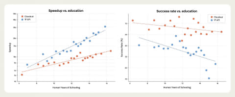 タスクの成功率を調整した場合も、同様の傾向が(弱まるものの)見られる。Claudeは大学卒業レベルのタスクを66%の確率で成功させる一方、高校卒業未満レベルのタスクでは70%の成功率を示す。これにより全体的な効果は減衰するが消滅せず、タスクの複雑度とClaudeの処理速度向上効果の相関は、複雑度と成功率低下の相関よりも急峻に増加する。