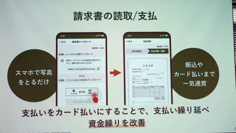 請求書支払いについては、受領した請求書をアップロード、もしくはスマートフォンで撮影することで、振込先口座情報や請求金額、支払期日などを自動で読み取り、支払データを自動で作成する。これにより入力ミスを削減し、支払業務を効率化できるとしている。