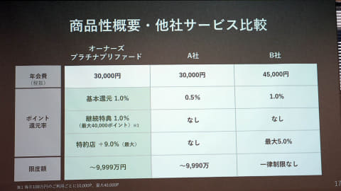 年会費は3万円。ビジネスオーナーズ特約店は、Vトリップ、エクスペディア、GO、S.RIDE、エクセルシオールカフェ、ドトール、プロント、マネーフォワードクラウド、スマートHRなど。