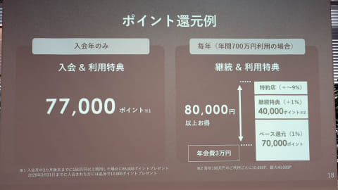 ポイント還元率に特化したカードで、Trunkを含む三井住友銀行の口座を支払口座とすると、対象店舗での利用金額に対し、最大2.5%のポイント付与を行なう。さらにビジネスオーナーズ特約店では最大9%のポイントを還元する。ベース還元率は1%で、継続特典が1%(最大4万ポイント)。限度額は最大9,999万円となる。