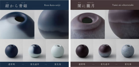 カラーは「紺から青磁」と「闇に朧月」の2種類。サイズは100×90mm(幅×高さ)目安で、個体差がある。