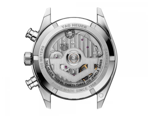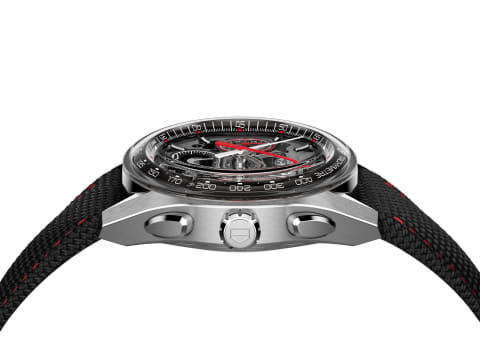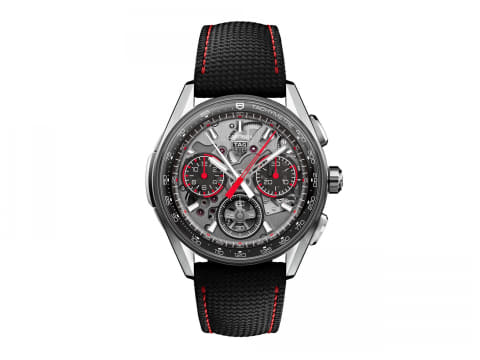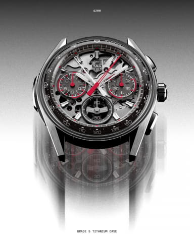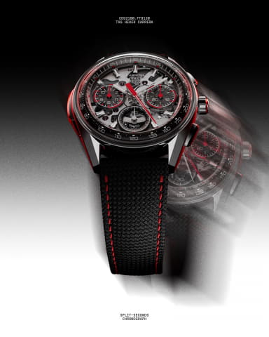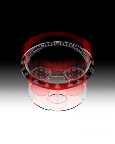新型のカレラ スプリットセコンド クロノグラフは、グレード5チタン製のケースを備え、ケース径は42mmを採用。スプリットセコンド機構は、ケース9時側に設けられたプッシュボタンで起動させる。ダイヤル全面を立体的なサファイアクリスタルが覆うグラスボックスデザインを採用する。