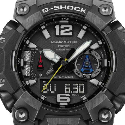 GWG-B1000は、防塵・防泥構造に耐振動構造を加え、耐久性を高めたモデル。方位、高度/気圧、温度計測ができるトリプルセンサーを搭載する。特定地点の方向を指し示すロケーションインジケーター機能が3時位置のサブダイヤルに搭載される。