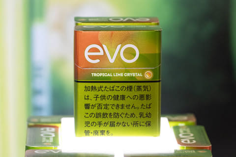 エボは25年5月に、加熱式たばこデバイス「Ploom AURA」と同時に発売したプレミアムラインのブランド。4銘柄の発売により、エボブランドは計12銘柄となる。Ploomに対応するたばこスティック全体ではメビウス、キャメルを含めて計31銘柄。