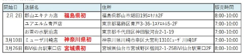 2月2日から新たに加わるのは、福島県郡山市の「郡山エキナカ店」、東京都内の「ユアエルム青戸店」「お茶の水駅前店」の3店舗。福島県での展開は今回が初めて。販売時間は店舗により異なり、郡山エキナカ店は8時から10時、それ以外の2店舗は7時~10時までとなっている。