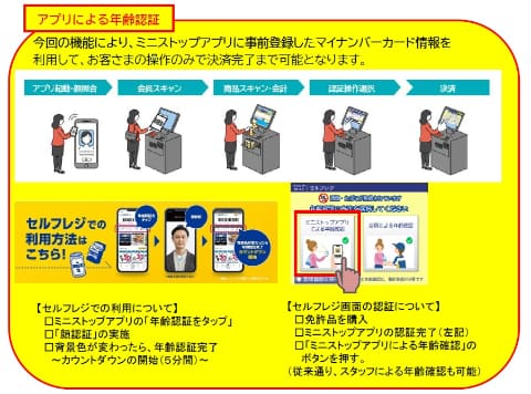これまでセルフレジの年齢認証は店舗スタッフの確認が必要だったが、アプリで事前登録しておくことで購入者自身で認証ができ、酒やたばこなど免許品のスピーディーな購入ができるようになる。