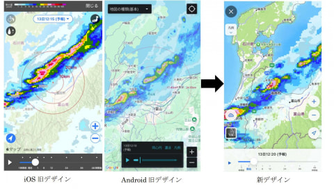 変更点の一つが、iOSとAndroidで異なっていた画面デザインの統一。端末ごとの操作差をなくし、利用環境に左右されない操作感を実現した。視認性の面では、県境線や海岸線の表示方法を調整し、強い雨が予想される場面でも地図が判別しやすくなるよう改善。画面中心を基準に表示していた赤い同心円は廃止し、強雨表示との色の重なりによる見えにくさを軽減した。