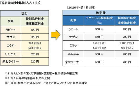 特急・座席指定料金の改定については、ラピート、サザン、こうや(なんば・新今宮・天下茶屋・堺東駅~極楽橋駅の相互間以外)、りんかん、泉北ライナーは、現行の520円から700円に値上げする。こうやのなんば・新今宮・天下茶屋・堺東駅~極楽橋駅の相互間は、現行790円、新料金1,100円。