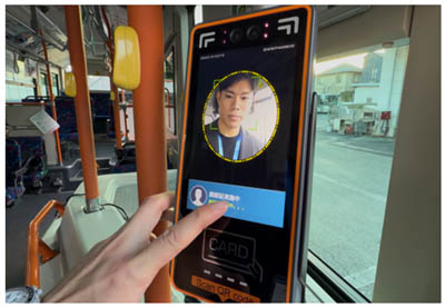 顔認証でのバス乗車方法は、運転席付近に設置された端末の画面をタッチし、顔を端末に向けて認証すると、「認証 OK・決済完了」の画面に切り替わる。顔認証での決済がうまくいかない場合は、現金もしくはICカードで支払うこととなる。