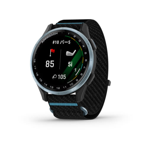手首にフィットしやすいよう、短めのナイロンバンドを採用し、29gの軽量ボディを実現。ディスプレイは鮮明で見やすい1.2型AMOLEDディスプレイで、ゴルフ場の直射日光下でも優れた視認性を発揮する。ディスプレイ解像度は390×390ピクセル。