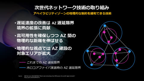 信頼性への投資については、同社はこの1年で3.8GWのデータセンター容量を追加しており、900万kmを超えるネットワーク網を整備している点を紹介。次世代ネットワーク技術として、従来の光ファイバより遅延を30%改善する「ホロコアファイバ」にも触れ、これによりデータセンター設計の柔軟性向上が期待できるとした。
