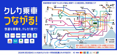 関東の鉄道事業者11社局は、クレジットカードのタッチ決済乗車による後払い乗車サービスにおける「相互利用」を26年3月25日から開始する。