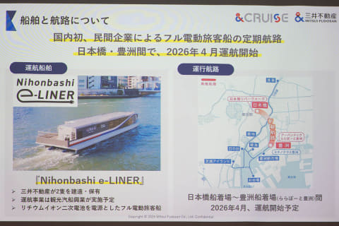 三井不動産は、フル電動旅客船2隻を建造・保有し、舟運プロジェクト「&CRUISE」を始動、4月から日本橋~豊洲間で定期便の運航を開始する。民間企業によるフル電動旅客船の定期航路は国内初となる。