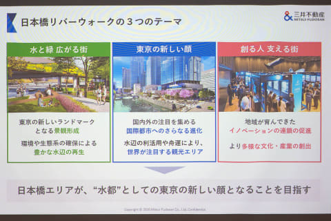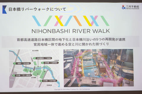 日本橋エリアでは、首都高速道路の地下化と日本橋川沿いの5つの再開発が連携した、空と川に開かれた街づくり「日本橋リバーウォーク」が進められている。そのテーマの1つとして水都再生を掲げ、水辺の利活用や舟運により世界に注目される観光エリアとなり、東京の新しい顔となることを目指している。