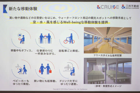 具体的には、停電や陸上交通の寸断などの有事における、代替移動ルートとしての活用が可能。座具を移動することで船内スペースも確保できる。また、運航に使用するリチウムイオン電池から、船内のコンセントを利用してスマートフォン等への給電ができる。