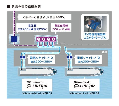 充電は、ららぽーと豊洲の船着場にて行なう。ららぽーと豊洲内に再生エネルギーの給電設備を新設。高圧受電設備から送電・再変圧し、4基の急速充電器を経由して、船舶に電気を供給する。