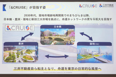 &CRUISEは、2030年代のまちびらきを計画している築地市場跡地再開発完了後には、日本橋と豊洲に築地を加えた新旧三大市場を拠点とし、舟運ネットワークのさらなる拡大を目指す。
