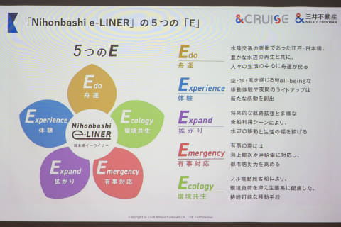 同船の名称を「Nihonbashi e-LINER」とし、観光汽船興業が運航事業を実施する。三井不動産は船主の立場。Nihonbashi e-LINERの「e」は、Edo(江戸)、Experience(体験)、Expand(拡がり)、Emergency(有事対応)、Ecology(環境共生)の5つの「E」で始まる言葉を表している。同船は東京都舟運活性化事業費補助金を適用予定。