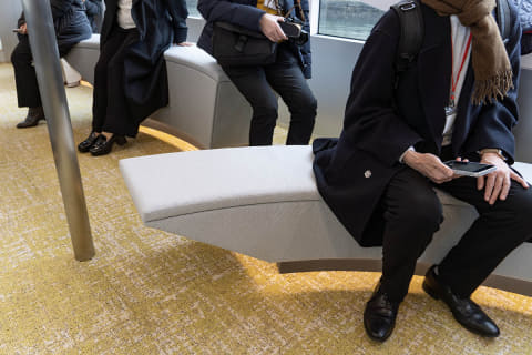 船内は、単なる移動手段ではなく、船に乗ること自体も目的となる空間づくりを目指したという。乗船定員は60名で、高さの異なるシートや、船内で仕事をする人に向けたテーブルなどを設けている。また、フリーWi-Fiやコンセントを装備する。