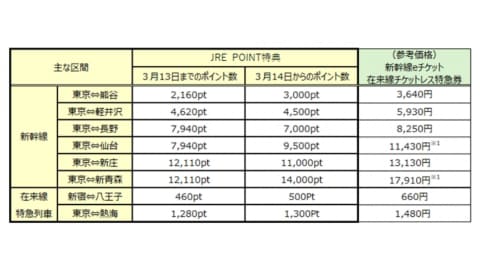 JR東日本は、JRE POINTで新幹線や在来線特急に乗車できる特典チケットについて、3月14日乗車分から交換ポイント数を改定する。対象は、乗車券と特急券がセットの「新幹線eチケット」と、特急券のみの「在来線チケットレス特急券」。