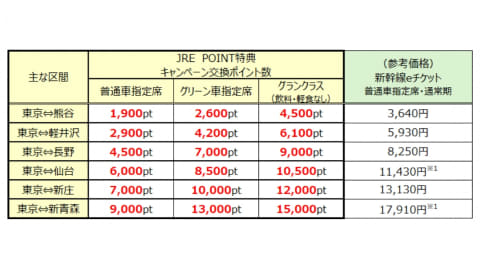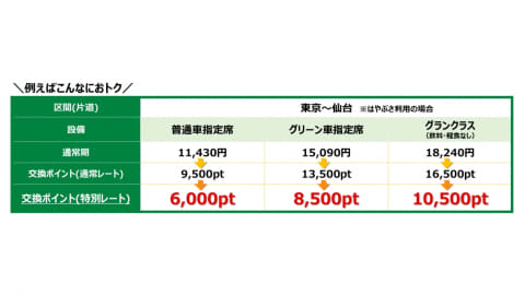 一例として、通常9,500ポイントの東京~仙台間が6,000ポイントで乗車できる。対象は普通車指定席だけでなく、グリーン車指定席やグランクラス(飲料・軽食なし)も含まれる。