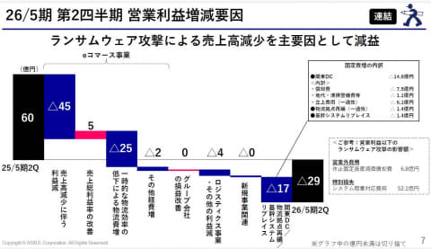 アスクルは28日、2026年5月期第2四半期決算を発表し、25年10月に発生したランサムウェア攻撃とそれに伴うシステム障害による大きな影響について報告した。売上高は前年同期比87.7%の2,087億円で、営業利益は66億円の赤字となった。また、システム障害に関わる特別損失52億円を計上している。