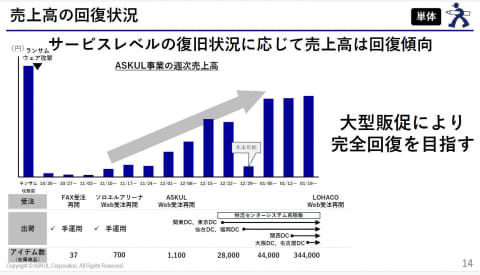 アスクルの各サービスは、25年10月17日以降のシステム障害で、出荷停止などの大きな影響を受け、1月25日に本格復旧した。11月以降、12月15日、年末年始以降など復旧範囲の拡大にあわせて、売上高は回復傾向となっている。