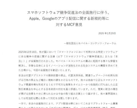 モバイル・コンテンツ・フォーラム(MCF)は、2025年12月に施行されたスマホソフトウェア競争促進法(スマホ新法)に関連し、刷新されたAppleとGoogleのアプリ配信規約に対する意見を公開した。