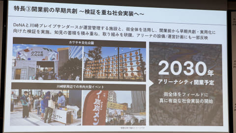 次世代都市モデルの社会実装に向けた取り組みは、アリーナ開業前から動き出す。DeNAや川崎ブレイブサンダースが運営管理する施設や周辺地域を舞台に、パートナー企業と早期共創・実用化に向けた検証を開始する。