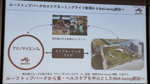 また、味の素はルーフトップパークのエリアネーミングライツを取得。パークから食・ヘルスケアを中心としたWell-being創出を目指す。