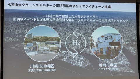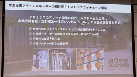 中でも「水素由来クリーンエネルギーのサプライチェーン構築」において、水素吸蔵合金・燃料電池⼀体型システム「HyDel(ハイデル)」の運用を25年12月から「カワサキ⽂化公園」にて開始。アリーナシティへの水素エネルギー導入に向けた常設稼動設備の検証・実証として、水素による公園施設の⼀部電力供給、年間稼動データの蓄積・分析、サプライチェーン構築検証に着手している。