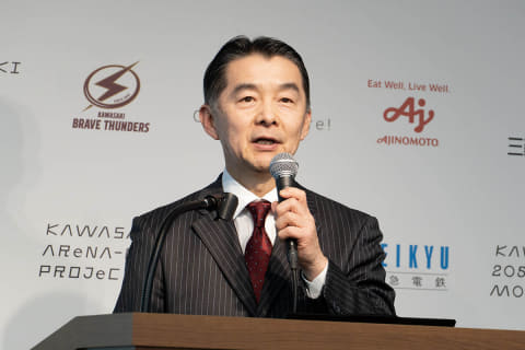 発表会では、アリーナ開発で協業する京急 取締役社長 川俣幸宏氏、川崎市 市長 福田紀彦氏も登壇。