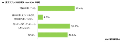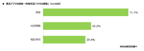 調査によると、東京都民のマイナンバーカード所有率は80.4%で、東京アプリの認知率は71.4%である一方、現在の利用率は35.4%だった。過去に利用したことがある層を含めても40.2%にとどまった。