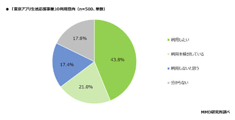 東京アプリを知っている人の「東京アプリ生活応援事業」の認知率は68.9%で、東京アプリを知らない人の同事業の認知率は6.3%だった。事業を説明したうえで利用意向を聞くと、「利用したい」が43.8%、「利用を検討している」が21%で、64.8%が利用に前向きな姿勢を示した。