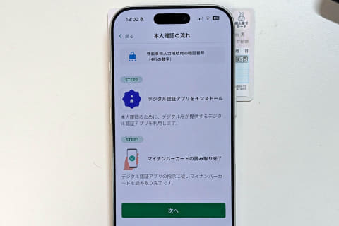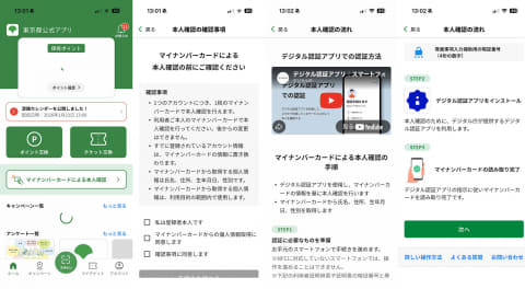東京アプリにログインして、ホーム画面の「マイナンバーカードによる本人確認」から、本人確認を行ないます。確認事項が表示されたあと、デジタル認証アプリで本人確認のやり方を表示。確認し、「マイナンバーカードで本人確認」を押すと、「デジタル認証アプリ」が起動します。