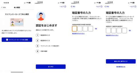 この後、デジタル認証アプリにログインし、手順を確認。 「利用者証明のための暗証番号」を入力し、その後もう一度「暗証番号の入力」(券面補助の4桁)を行なった後で、マイナンバーカードを読み取ります。 許可する内容を確認し、認証を完了すると、「本人確認完了」となります。