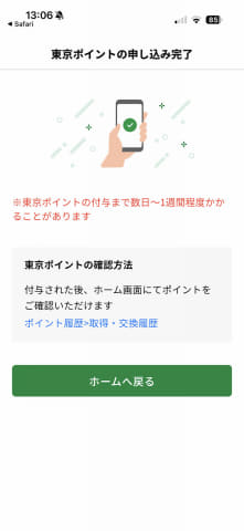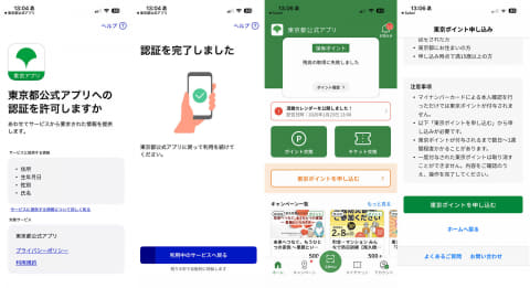 続いて、本人確認完了画面に表示されている「東京ポイントを申し込む」を押して、東京ポイントの申込みを行なうと、申込みが完了。ポイントが後日付与されます。付与されたポイントは、都立施設の利用チケットやキャッシュレス決済サービスのポイントに交換できます。