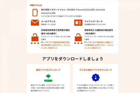 東京アプリ生活応援事業への参加に必要なものは、NFC対応のスマートフォン(iPhone/Android)と、「東京アプリ」、「マイナンバーカード」、「デジタル認証アプリ」。またマイナンバーカードのパスワードも利用する。